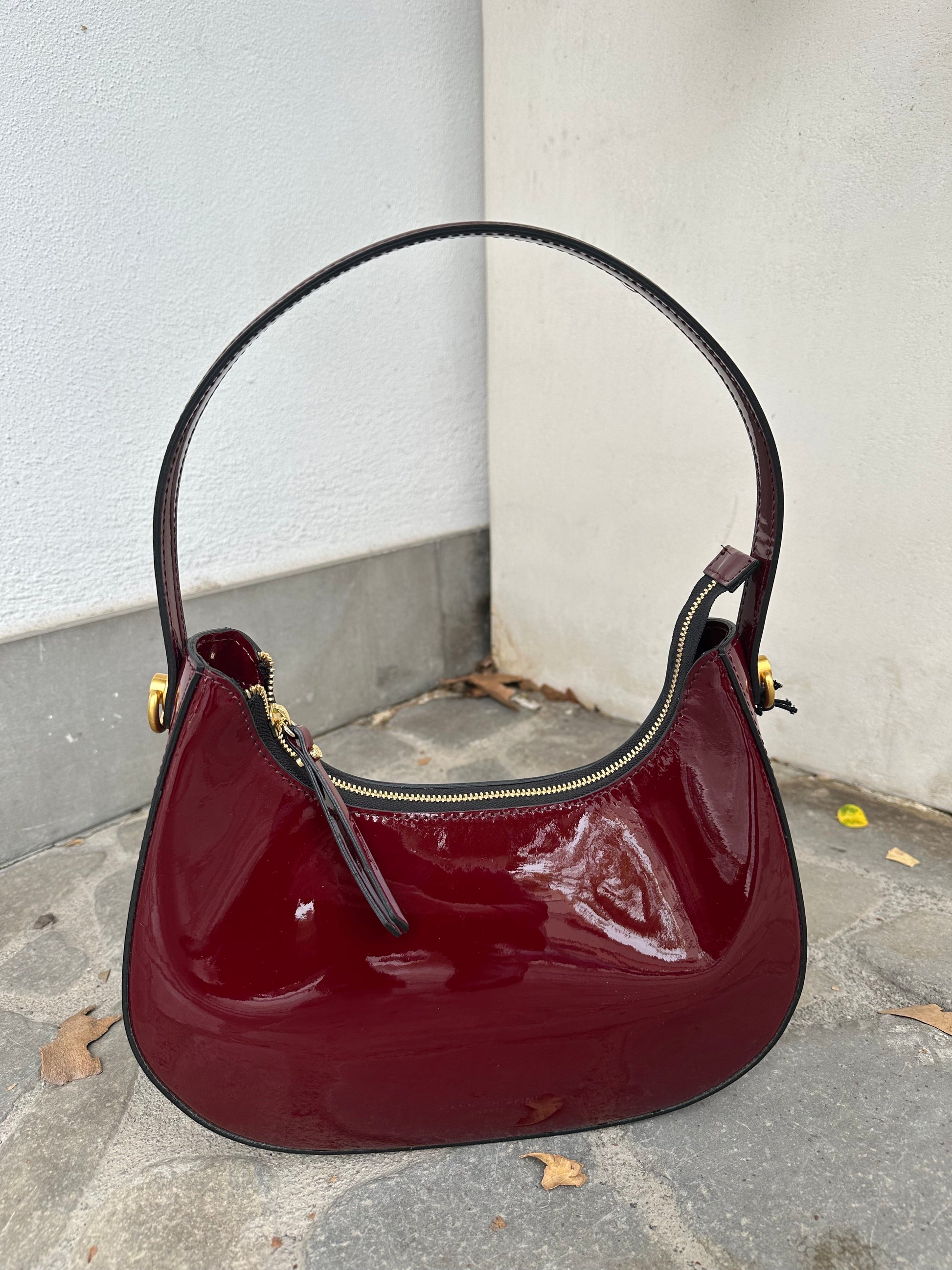 Borsa in pelle lucida bordeaux con manico in pelle e tracolla in tessuto regolabile e removibile.