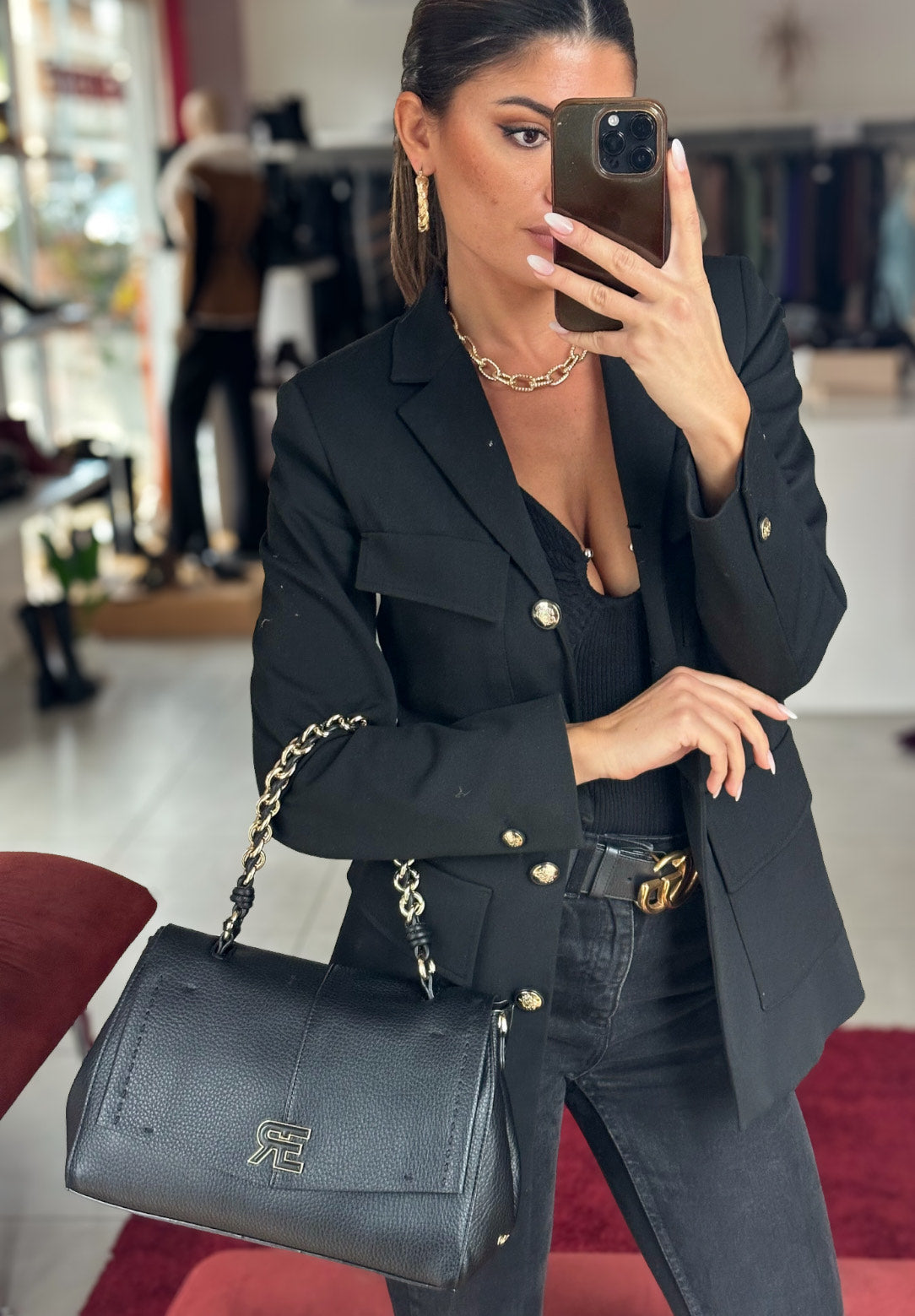 Borsa in morbida pelle ecologica nera, con manico a catena oro, tracolla interna in pelle regolabile.