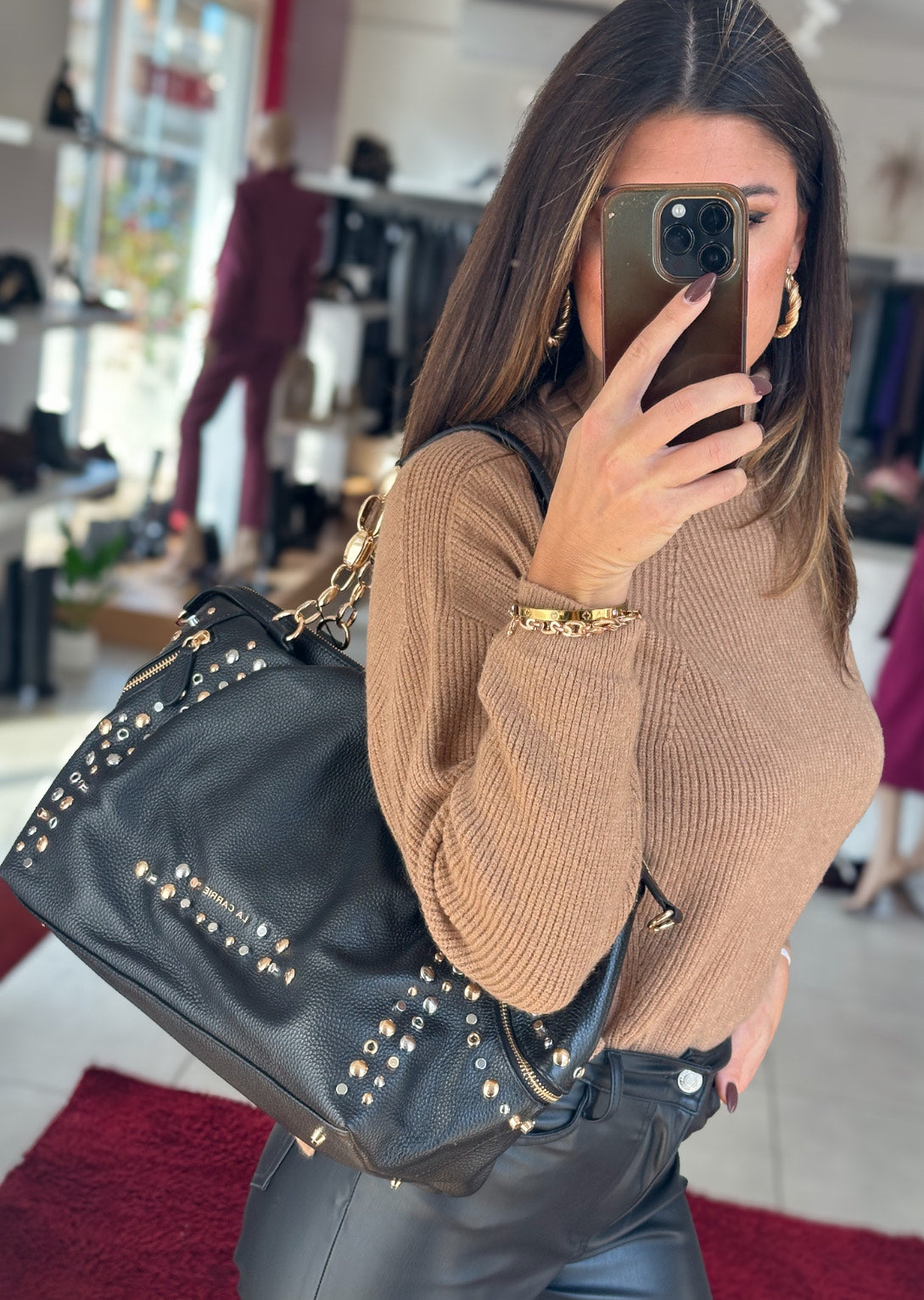 Borsa shopping in morbida pelle martellata nera, con borchie applicate sui profili e manici di catena oro. Dotata di tracolla lunga removibile.