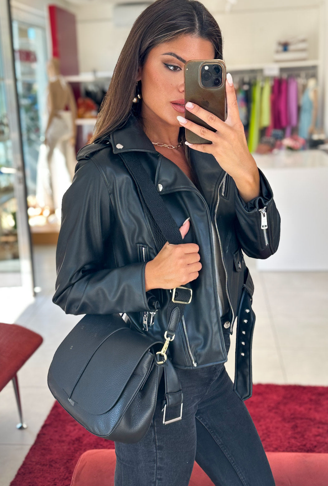 Borsa in morbida pelle martellata nera, con tracolla in tessuto regolabile e removibile.