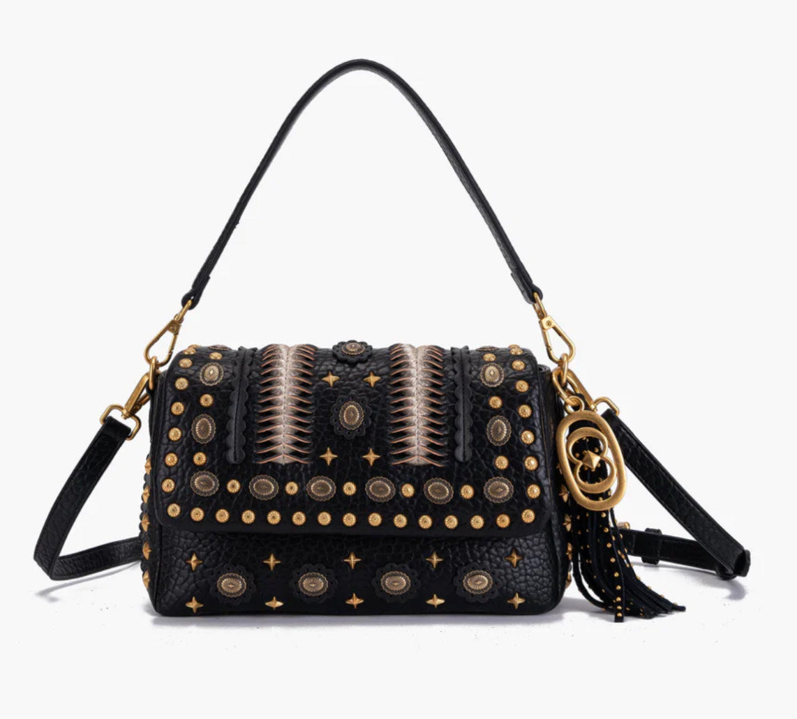Borsa a spalla nera effetto martellato con borchie oro, manico e tracolla rimovibile.