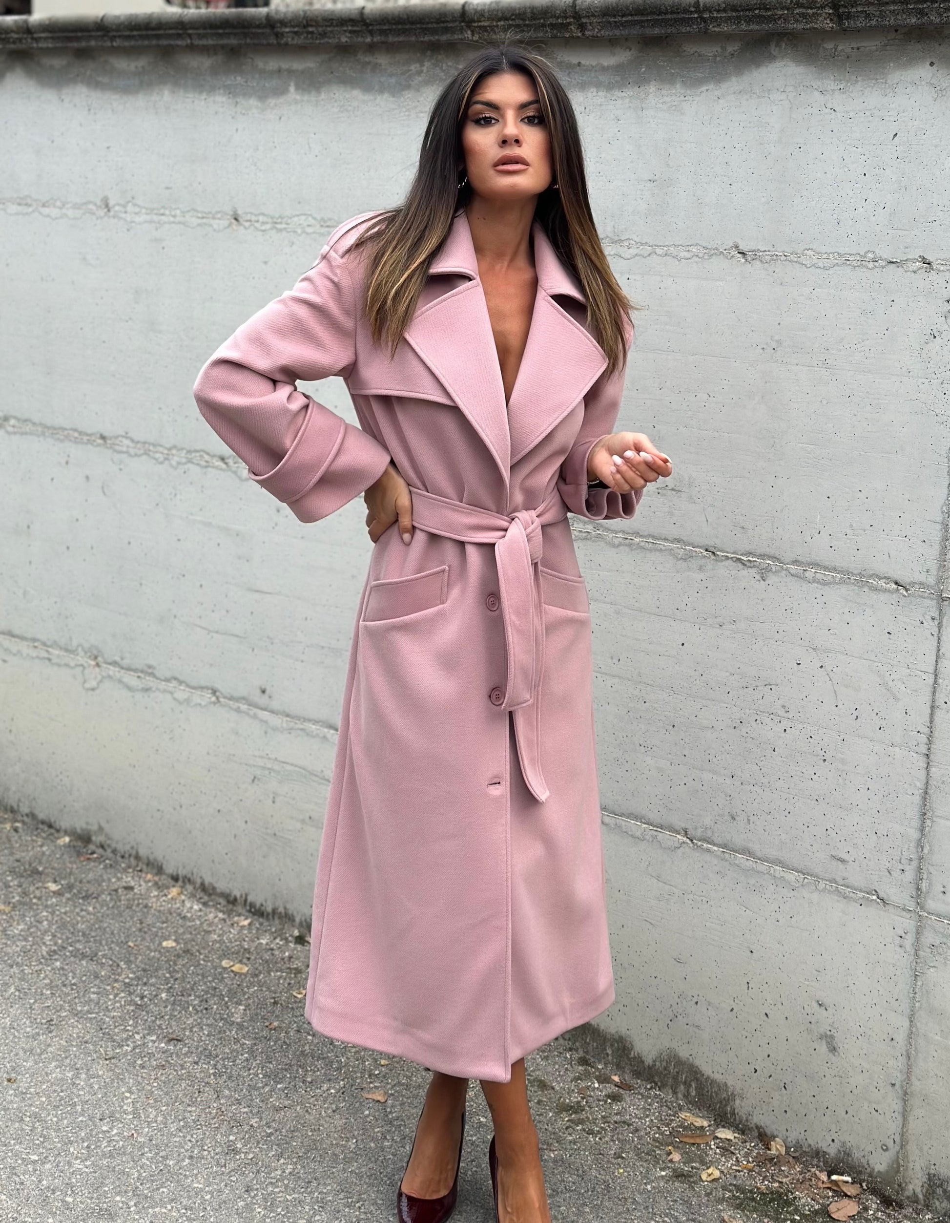 Cappotto color rosa cipria con bottoni in tinta e cintura regolabile in vita.