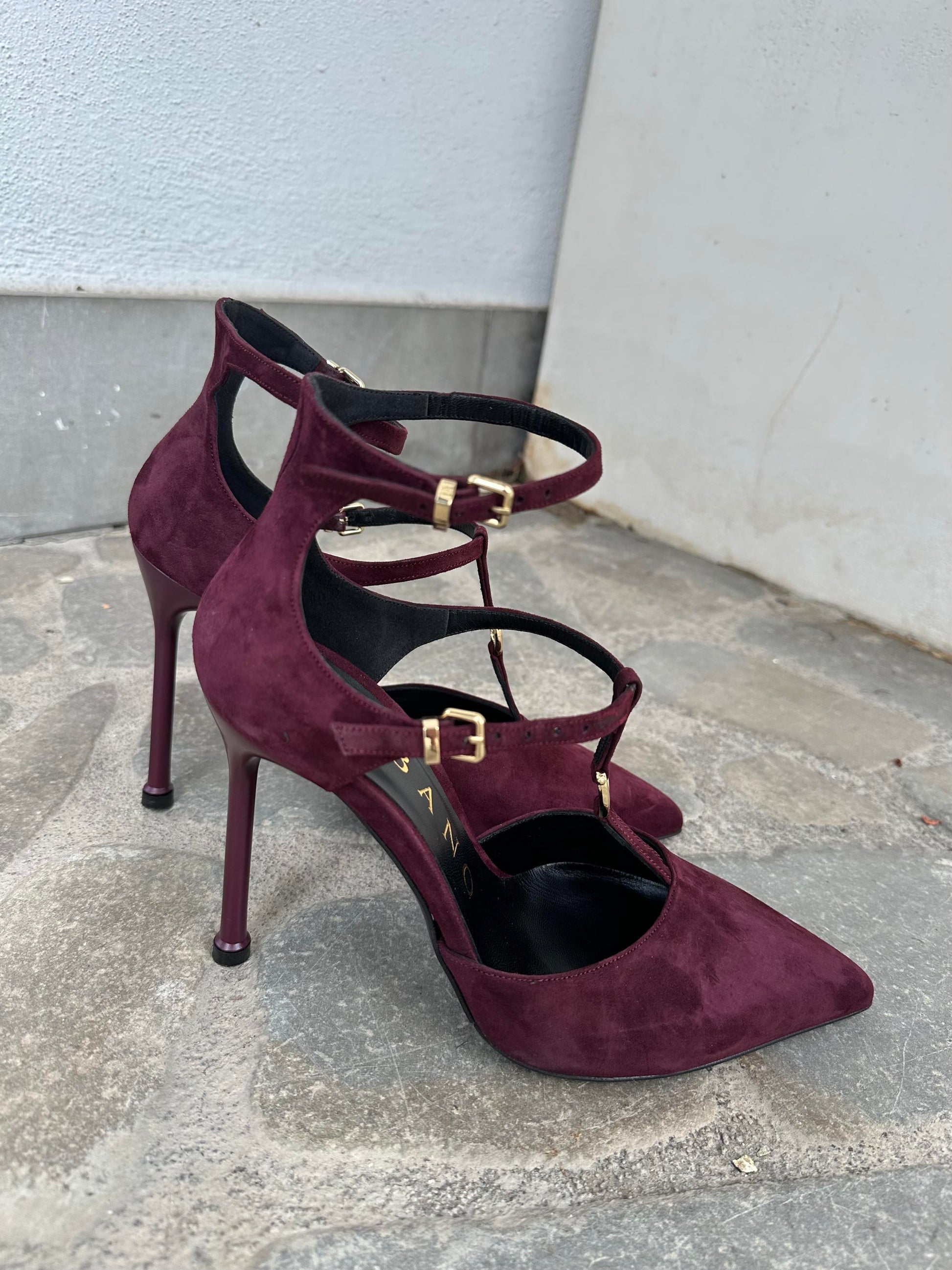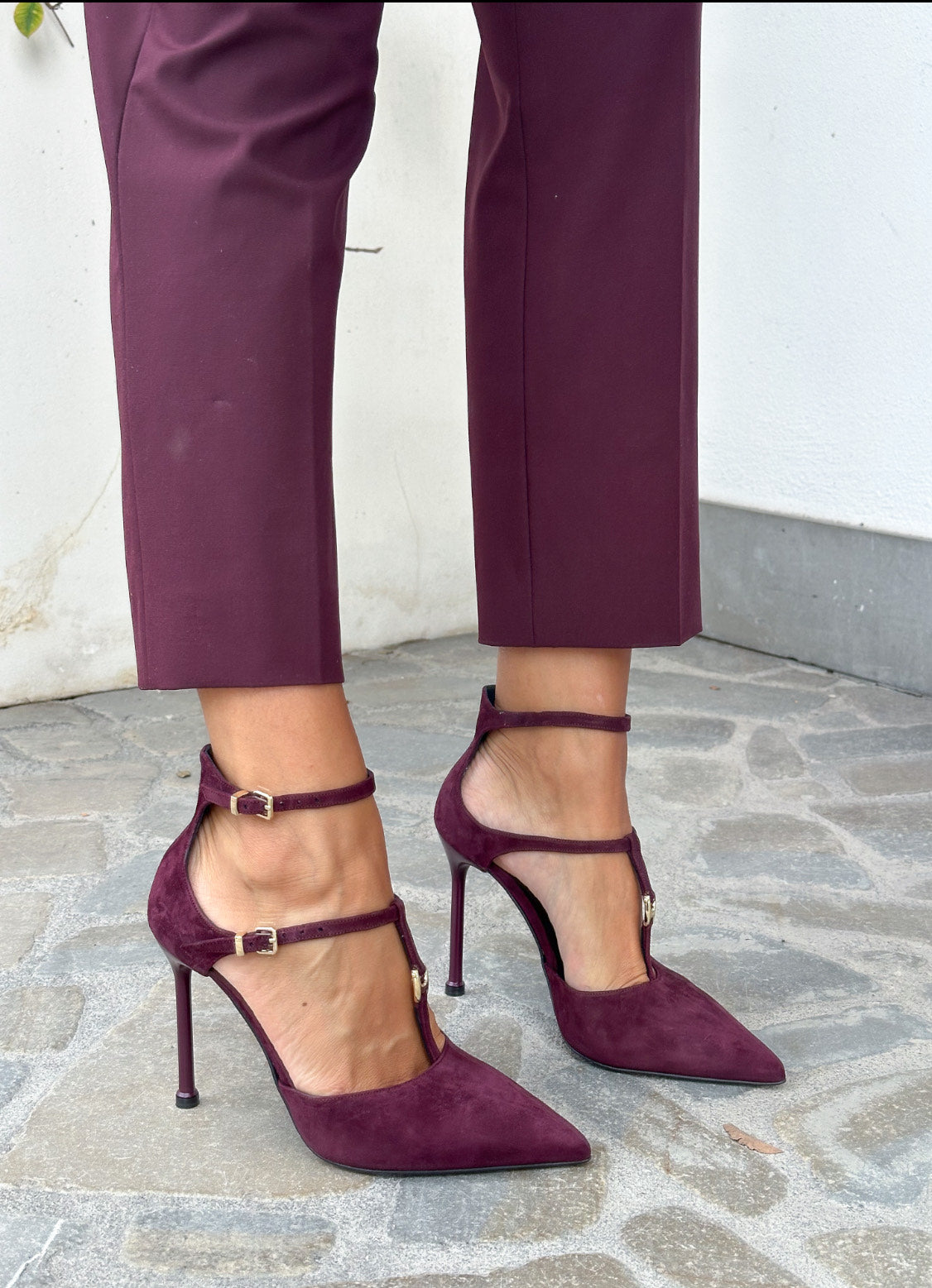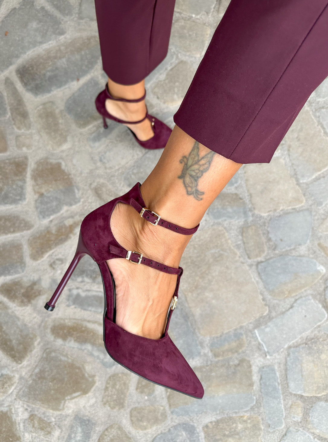 Decollete' in morbida pelle scamosciata bordeaux con doppi cinturini regolabili.