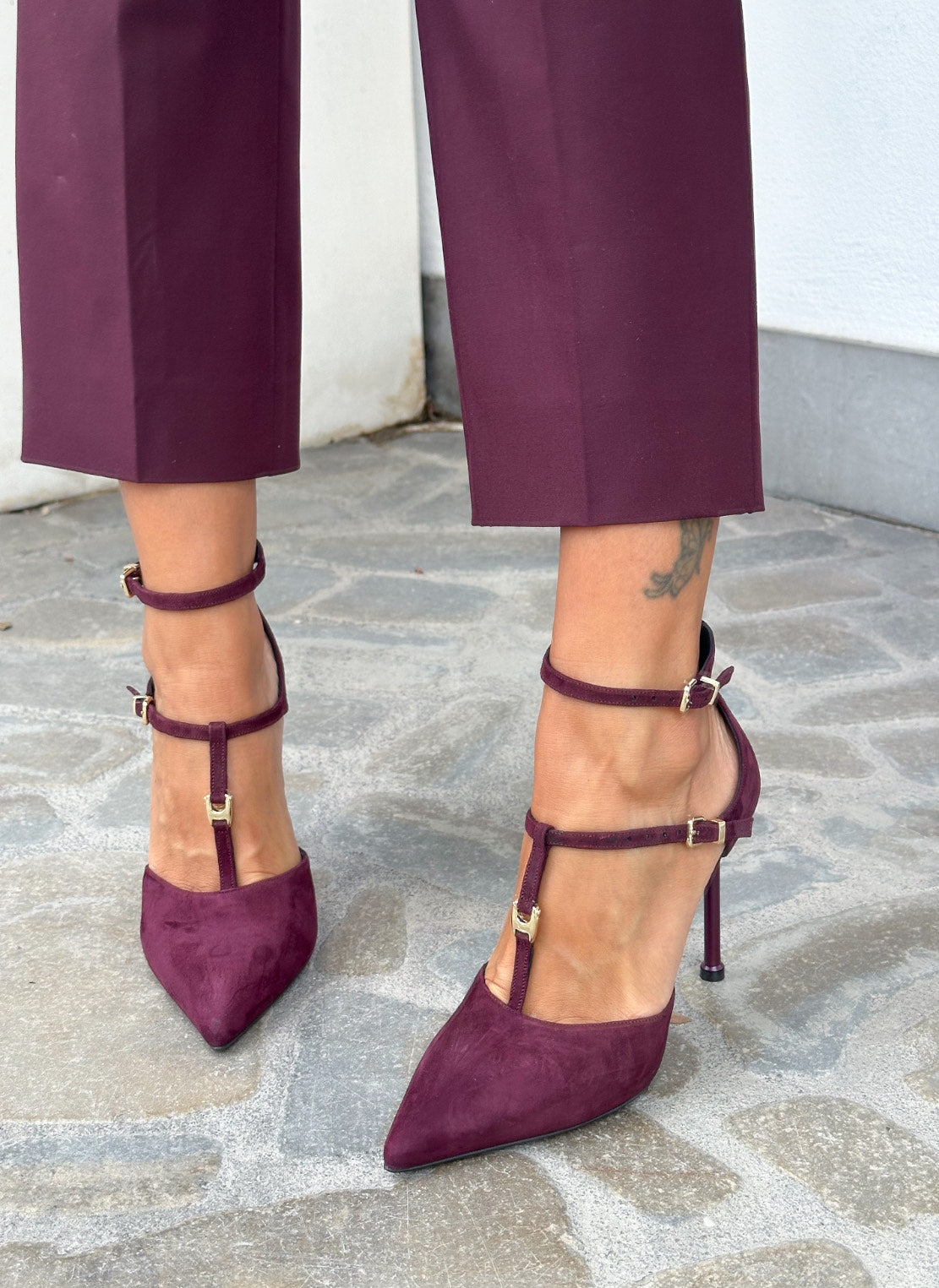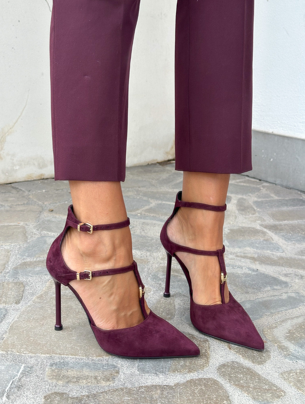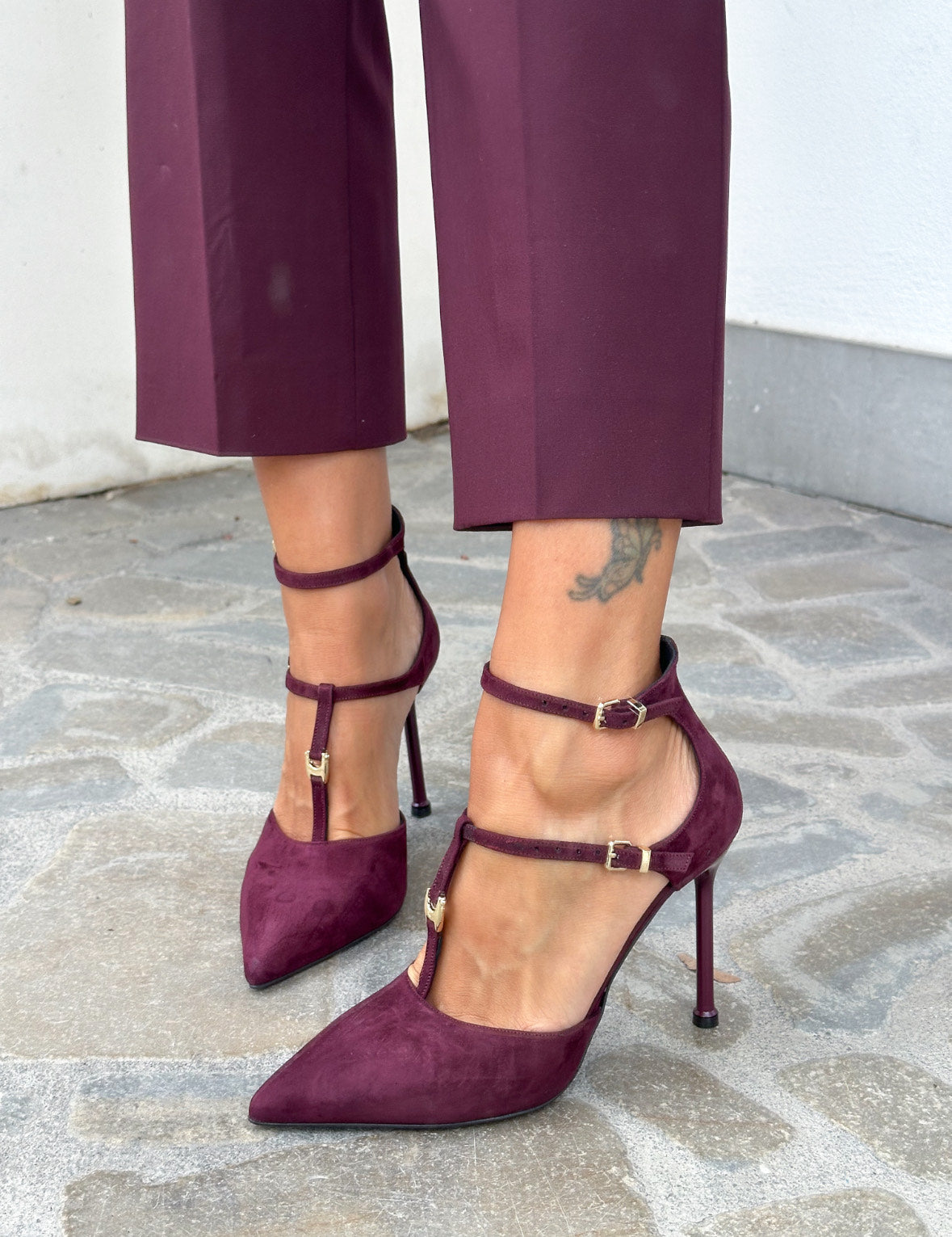 Decollete' in morbida pelle scamosciata bordeaux con doppi cinturini regolabili.