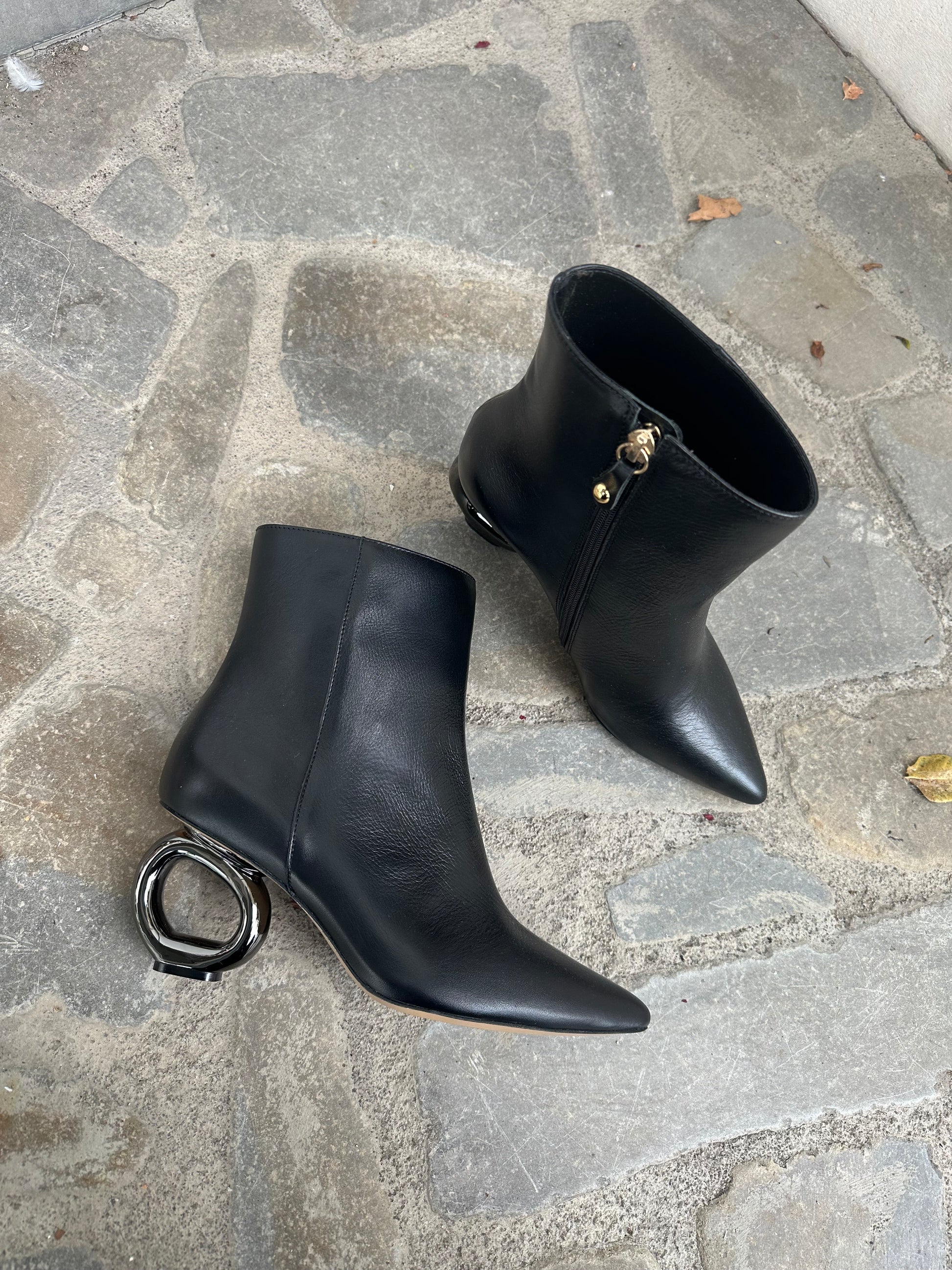 Stivaletto in morbida pelle nera con tacco sculura argento, zip laterale.