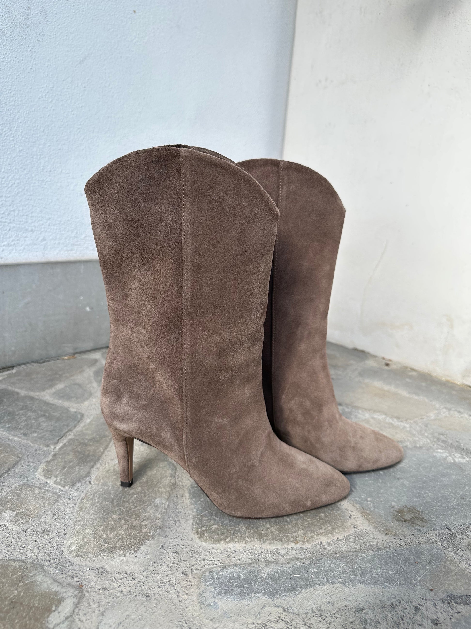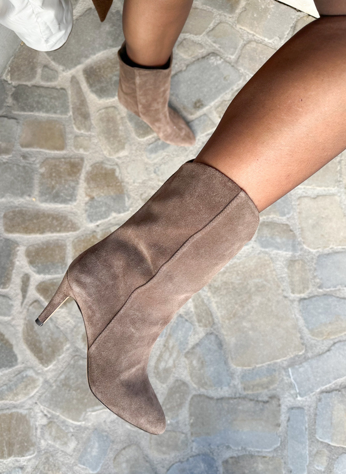 Stivaletto tubolare in mobida pelle scamosciata color tortora.
