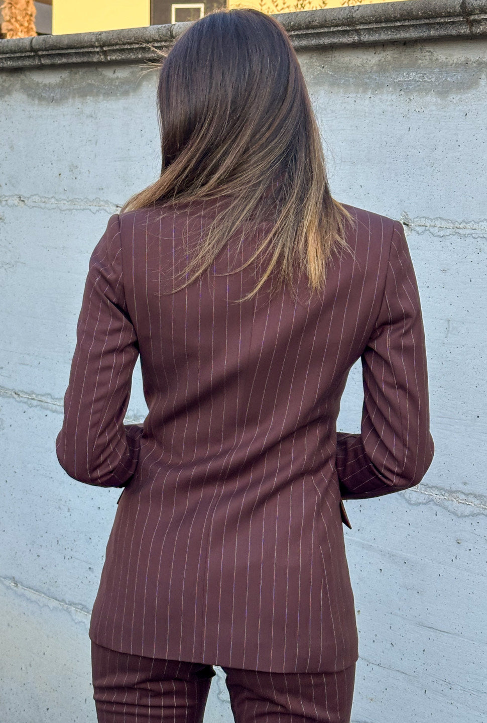 Tailleur in tessuto tecnico composto da giacca doppiopetto gessata marrone con bottoni oro, foderata internamente, e pantalone a vita alta modello flare a zampa.