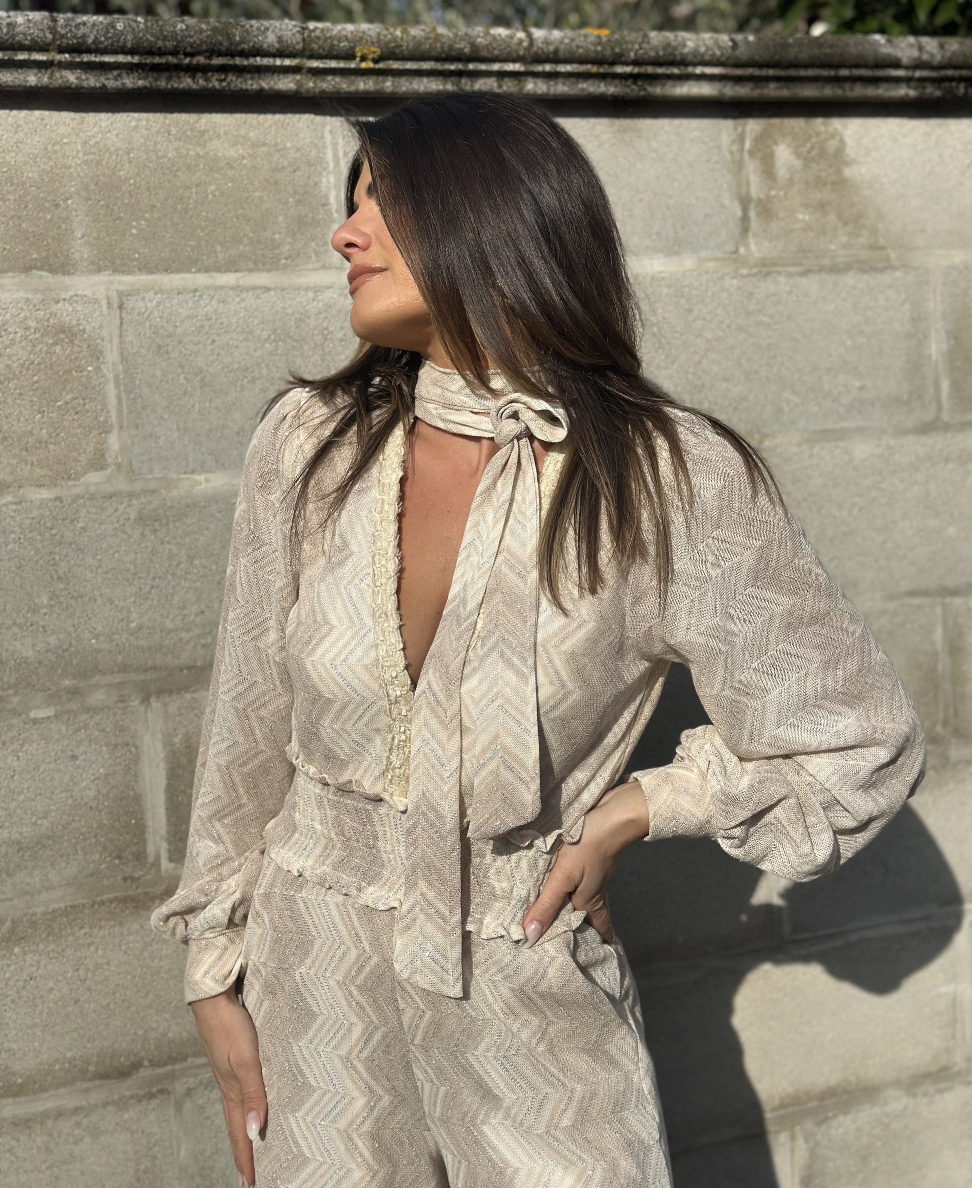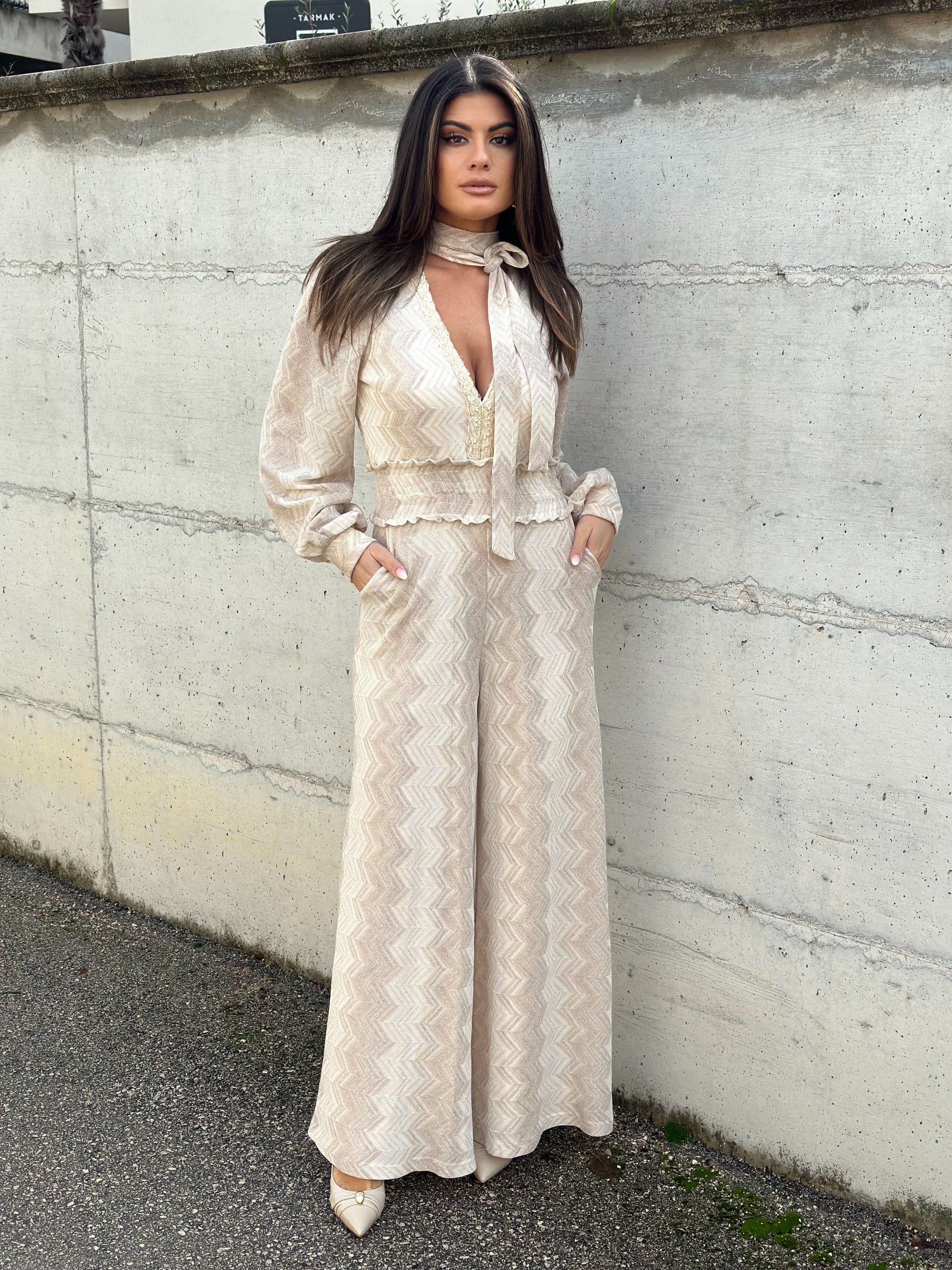 Tuta con pantalone a palazzo a fantasia color avorio, vita elasticizzata.